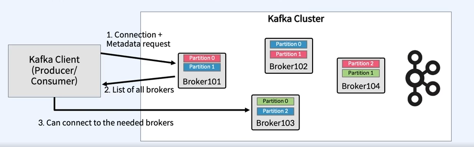 - Client는 특정 Broker에게 연결하여 전체 Cluster에 연결