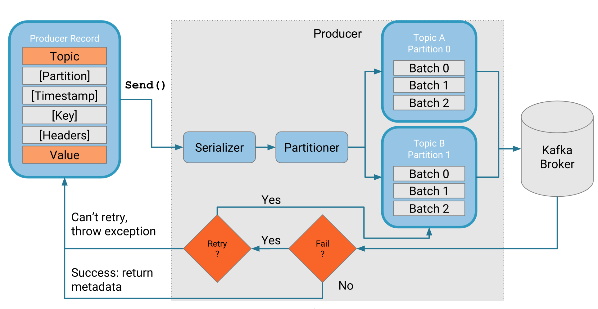 - Kafka는 Data를 제대로 저장한지 여부를 알려주며 성공한다면 metedata를 return하여 준다. 실패 시에는 retry를 시도한 다음에, 특정 갯수만큼 이후에는 Exception처리한다.