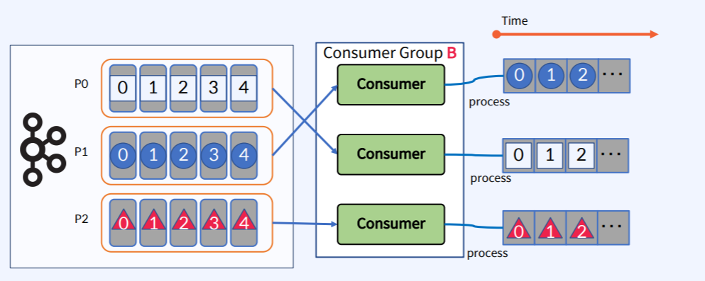- Group B에서 각 Consumer는 서로 다른 Partition의 Offset 정보를 가지고 있다.