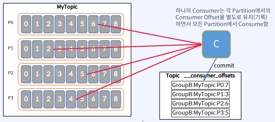 - Consumer Group 내에 Consumer가 한개, Consumer가 모든 Partition의 offset정보를 가지고 있는다.