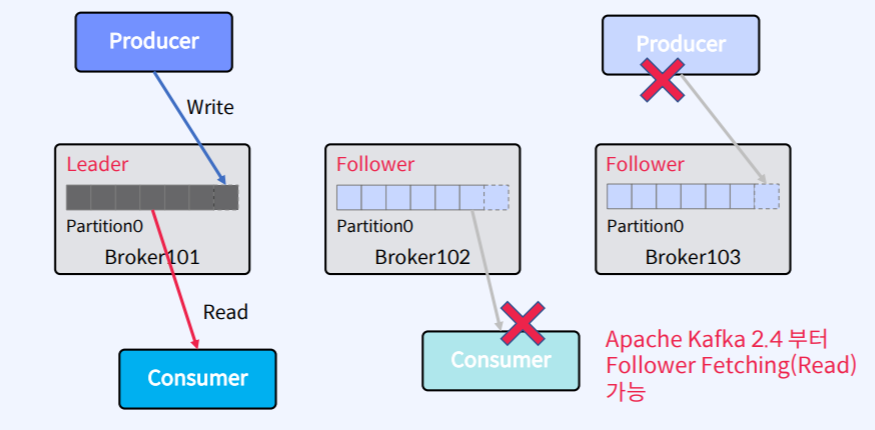 - Client(Producer/Consumer)는 Leader에게서만 Write, Read 처리 할 수 있다.