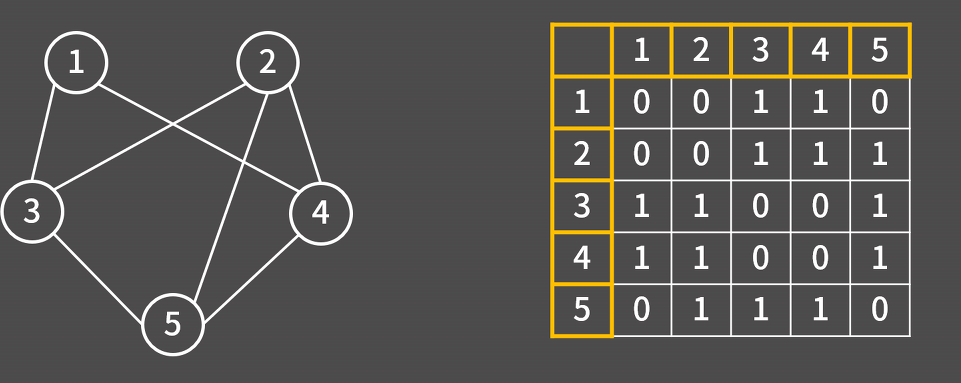 편의상 단순 그래프, 즉 두 정점 사이의 간선이 1개 이하인 그래프라고 할 때 연결된 두 정점에는 1을, 연결되지 않은 두 정점에는 0