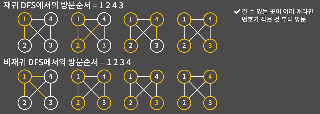 STACK 혹은 재귀로 구현 가능 ( 재귀로 구현 시와 STACK이랑 구현 시 결과 값이 다를 수 있으니 주의 )