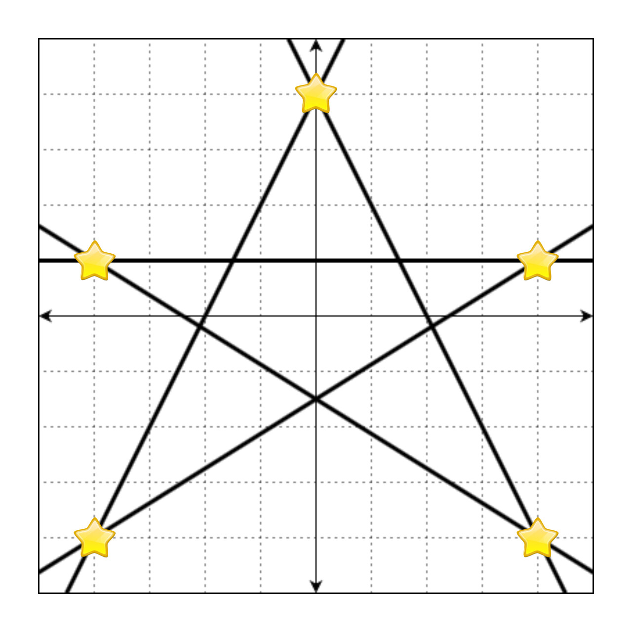 이때, 모든 교점의 좌표는 (4, 1), (4, -4), (-4, -4), (-4, 1), (0, 4), (1.5, 1.0), (2.1, -0.19), (0, -1.5), (-2.1, -0.19), (-1.5, 1.0)입니다. 이 중 정수로만 표현되는 좌표는 (4, 1), (4, -4), (-4, -4), (-4, 1), (0, 4)입니다.