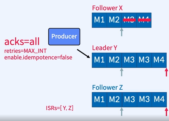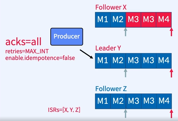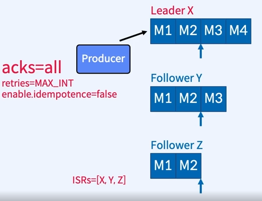 - Replica Factor=3, Producer가 4개의 Message 이라고 가정
