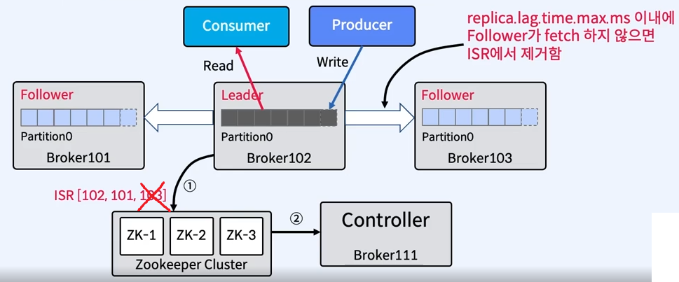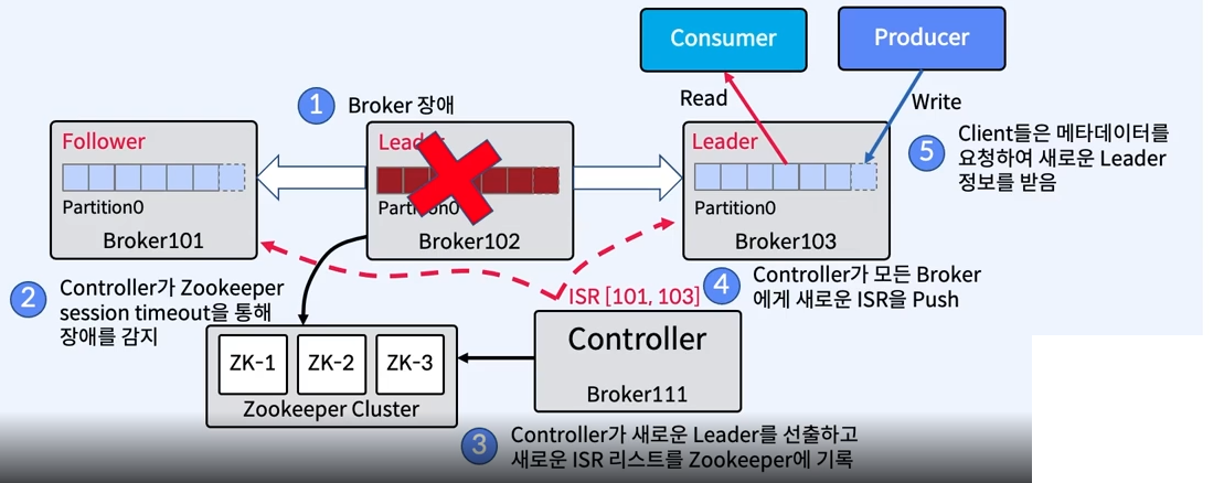 - Controller가 ISR Follower 중 하나를 새로운 Leader로 선출한다.