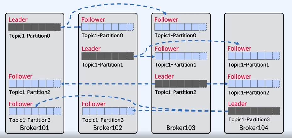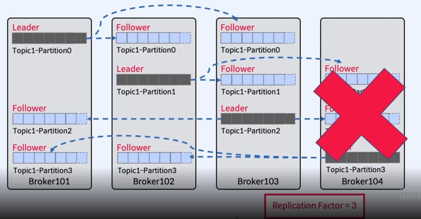 - Broker 104에서 장애가 발생하게 되면, Parition3에 대해서는 위 Leader가 실패하여 재선출 되는 과정을 진행