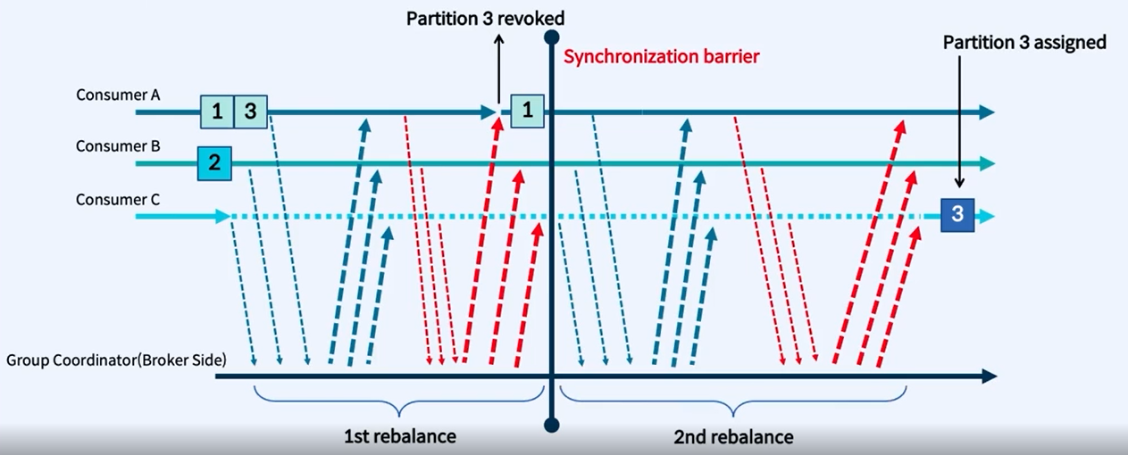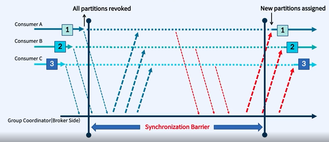 - 안전적인 측면에서는 좋지만, "Stop-the-world" Protocol이라 불리며, Group Consumer들이 Rebalancing하는 동안 Consume을 하지 못한다. (Synchronziation barrier)