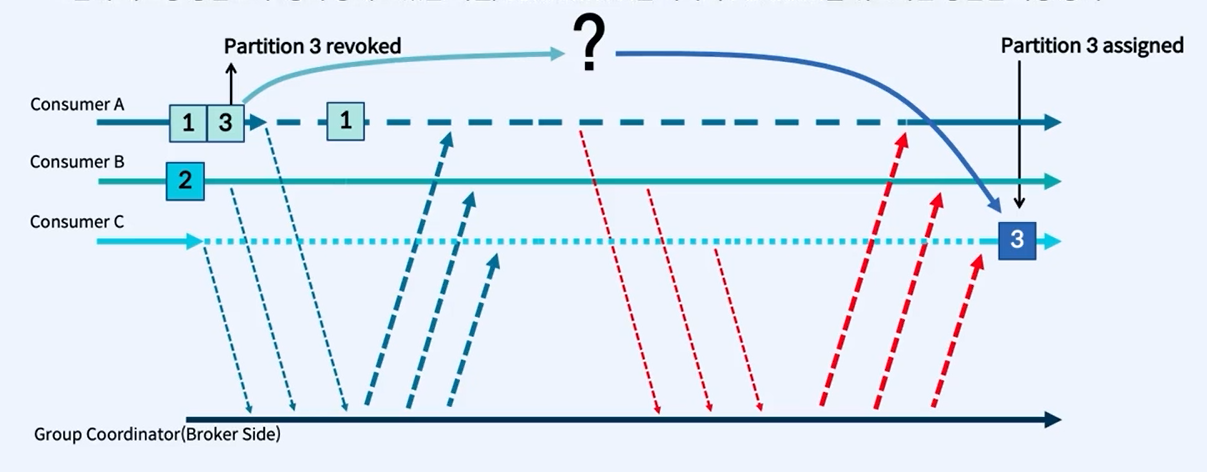 위 그림을 보면서, Consumer B는 별도로 Partition이 바뀌지 않고, Consumer A의 Partition1 도 변하지 않는데 이러한 Parition까지 Revoke하여 Consumer가 동작하지 못해야라는 의문이 생길 수 있다.