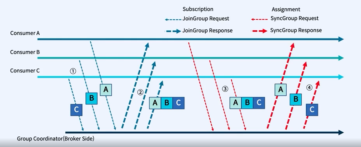 - 기존 Consumer A,B와 Consumer C는 Join Group Request를 보내며 아래 그림과 같이 동작한다.