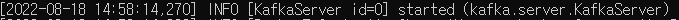 $ bin/kafka-server-start.sh config/server.properties # [2022-08-18 14:58:14,270] INFO [KafkaServer id=0] started (kafka.server.KafkaServer)