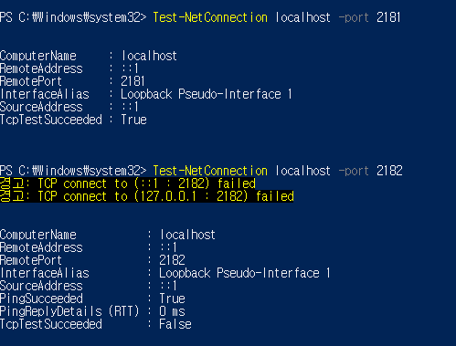 - 아래 명령어를 치게 되면 연결이 되어있다면 TcpTestSucceeded : True 나타납니다.