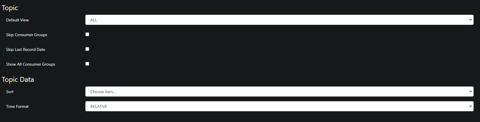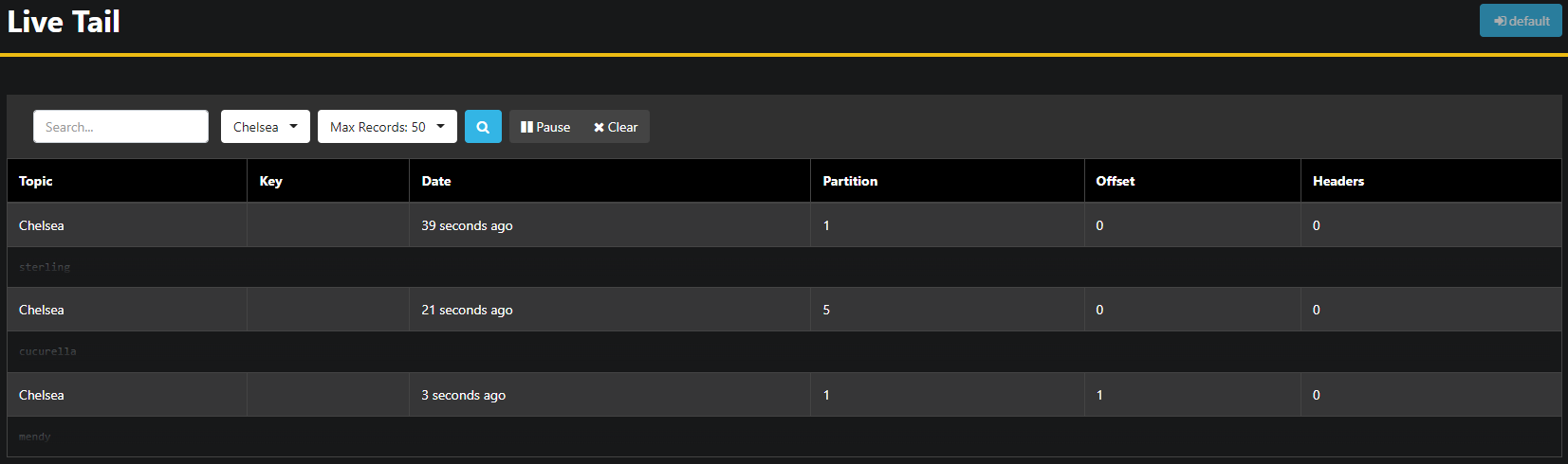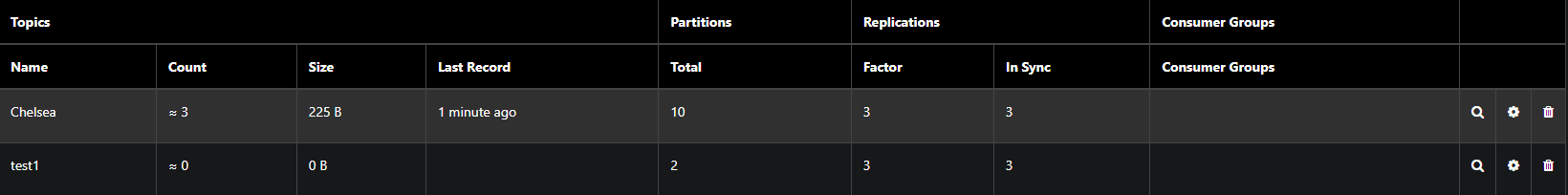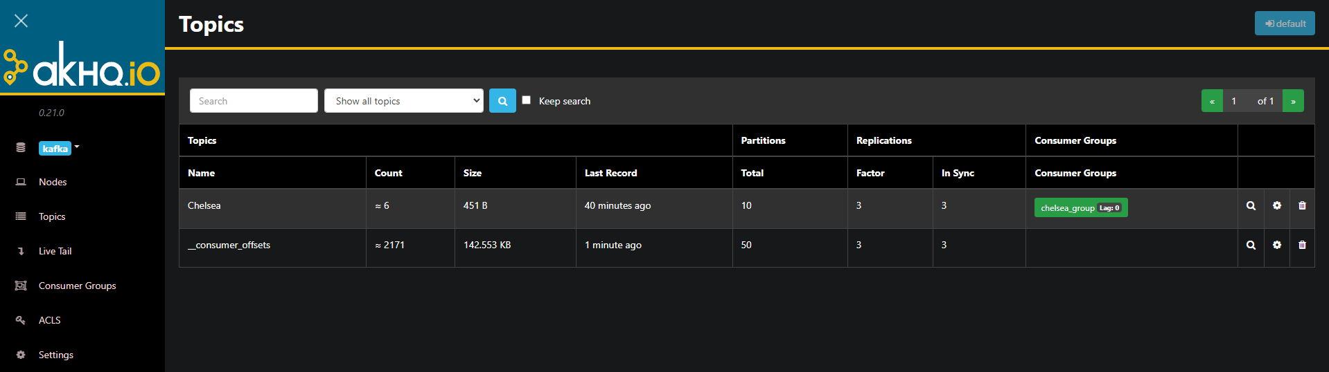 akhq: image: tchiotludo/akhq:latest hostname: akhq depends_on: - kafka-1 environment: AKHQ_CONFIGURATION: | akhq: connections: kafka: properties: bootstrap.servers: IP:PORT ports: - 8080:8080CONTAINER ID IMAGE COMMAND CREATED STATUS PORTS NAMES da3fa7e21368 tchiotludo/akhq:latest "docker-entrypoint.s…" 58 minutes ago Up 58 minutes 0.0.0.0:8080->8080/tcp kafka-akhq-1 cb2e8999ec16 confluentinc/cp-kafka:6.2.0 "/etc/confluent/dock…" 58 minutes ago Up 58 minutes 9092/tcp, 0.0.0.0:29092->29092/tcp kafka-kafka-2-1 8a3ee271469d confluentinc/cp-kafka:6.2.0 "/etc/confluent/dock…" 58 minutes ago Up 58 minutes 9092/tcp, 0.0.0.0:39092->39092/tcp kafka-kafka-3-1 0ace91840f77 confluentinc/cp-kafka:6.2.0 "/etc/confluent/dock…" 58 minutes ago Up 58 minutes 9092/tcp, 0.0.0.0:19092->19092/tcp kafka-kafka-1-1 45828848e33b confluentinc/cp-zookeeper:6.2.0 "/etc/confluent/dock…" 13 hours ago Up 58 minutes 2181/tcp, 2888/tcp, 0.0.0.0:32181->32181/tcp, 0.0.0.0:42888->42888/tcp, 3888/tcp, 0.0.0.0:43888->43888/tcp kafka-zookeeper-3-1 ec5bdd5c24e5 confluentinc/cp-zookeeper:6.2.0 "/etc/confluent/dock…" 13 hours ago Up 58 minutes 2181/tcp, 2888/tcp, 0.0.0.0:22181->22181/tcp, 0.0.0.0:32888->32888/tcp, 3888/tcp, 0.0.0.0:33888->33888/tcp kafka-zookeeper-2-1 863c31eaab10 confluentinc/cp-zookeeper:6.2.0 "/etc/confluent/dock…" 13 hours ago Up 58 minutes 2181/tcp, 2888/tcp, 0.0.0.0:12181->12181/tcp, 0.0.0.0:22888->22888/tcp, 3888/tcp, 0.0.0.0:23888->23888/tcp kafka-zookeeper-1-12. AKHQ