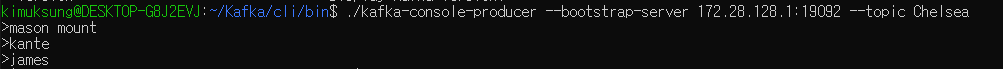 $ ./kafka-console-producer --bootstrap-server 172.28.128.1:19092 --topic Chelsea