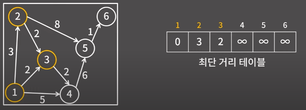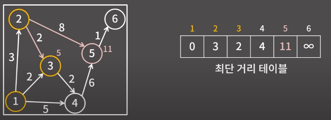 - 이중에서 가장 작은 Edge는 Node 3과 연결된 2로 갱신 시키고 Node에 대해 확정을 시켜준다.