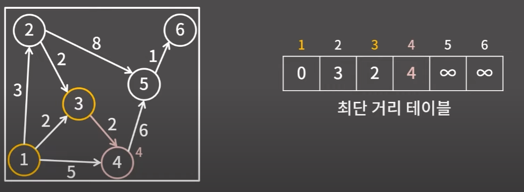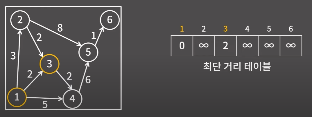 2. Heapq에서 거리가 가장 작은 원소를 선택, 최단 거리 Table에 있는 값과 다르면 넘어간다.