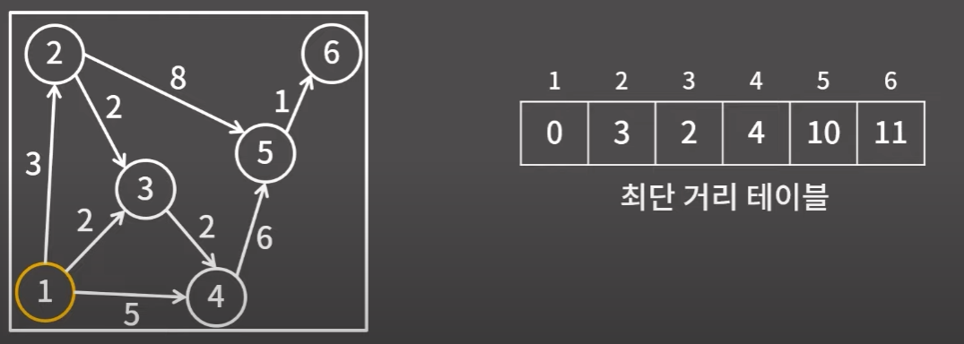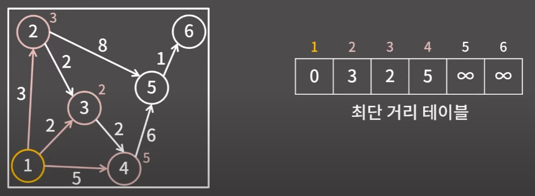 - 아래와 같은 그래프에서 1부터 시작한다면, 각 Node별로 최단 거리 값이 결과가 나타난다.