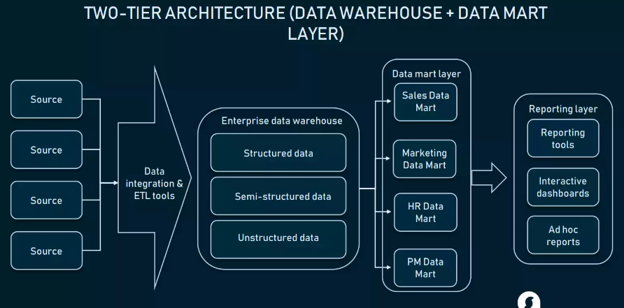 - 데이터 마트는 필요한 데이터가 보고서, 대시보드 및 시각화 자료로 생성되기 전에 수집 및 정리되는 중앙화된 공간으로 널리 활용됨