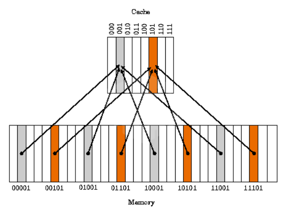 - 캐시 메모리는 메인 메모리에 비해 크기가 매우 작기 때문에 메인 메모리와 1:1 매칭이 불가능하다.