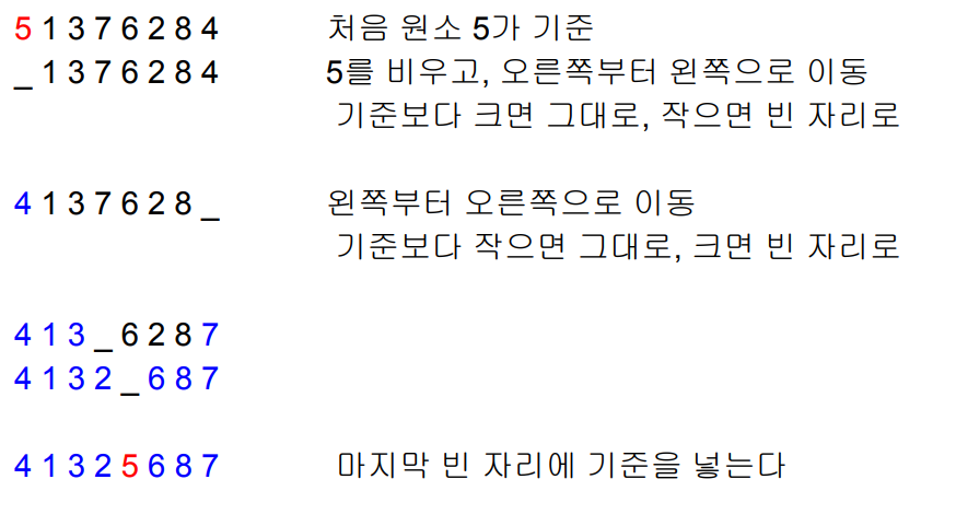 핵심 아이디어: 특정 원소를 중심으로 “작은 것” 왼쪽, “큰것” 오른쪽