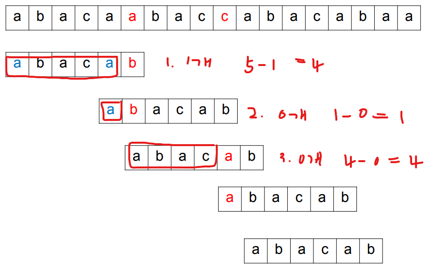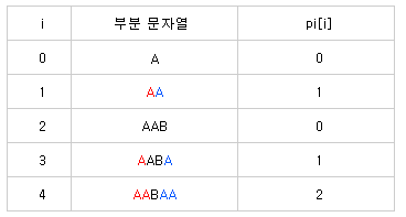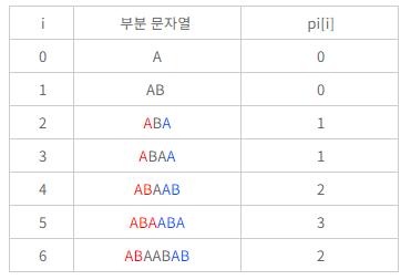 - 문자열에 대해서 prefix == suffix 될 수 있는 부분 문자열 중 가장 긴 것의 길이