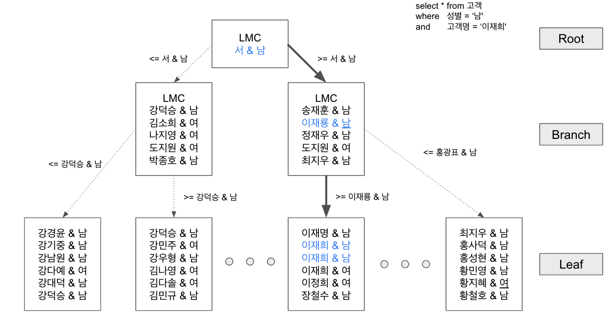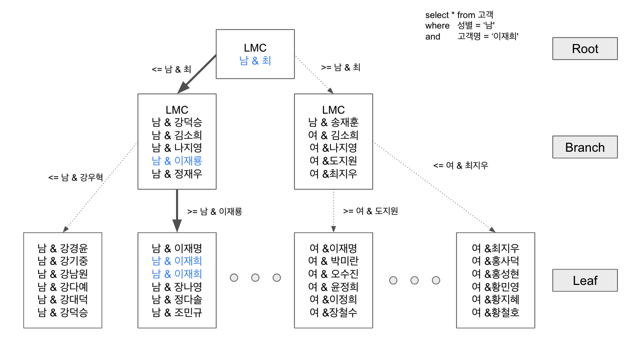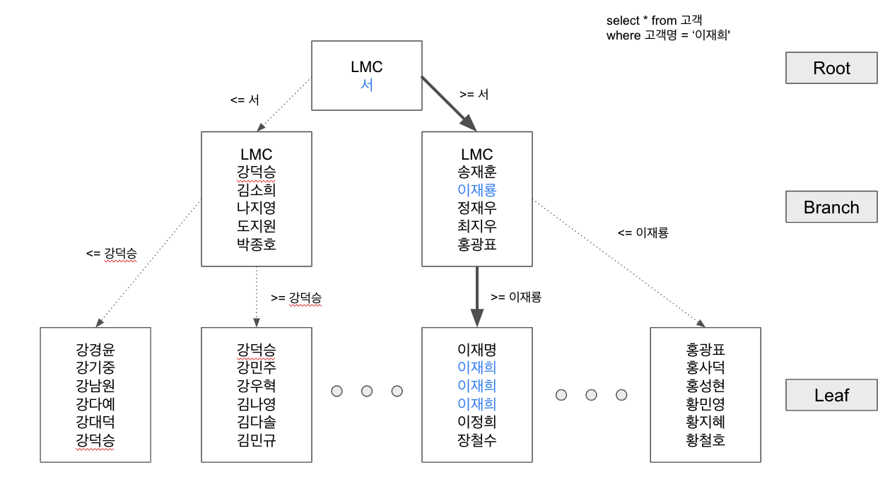 - 수직적 탐색 = Index Scan 시작 지점 찾는 과정