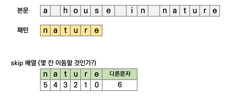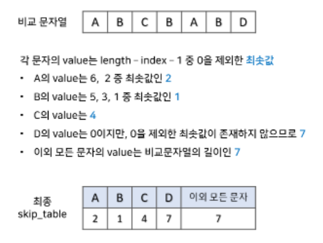 - KMP 알고리즘과 같이 건너뛰는 경우를 저장하는 배열(skip_table)을 만들어야 합니다. 이때 배열은 본문 문자열이 비교 문자열에 존재하는지, 존재한다면 불일치 시 얼만큼 건너뛰는지를 판단하는 정보를 가지고 만들게 됩니다.