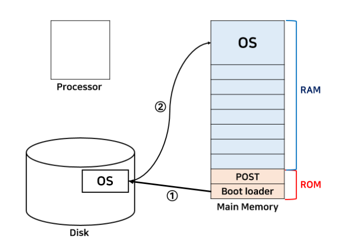 이어서 Boot Loader를 Disk에서 OS영역을 불러와 메인 메모리에 가져온다. ( 이 구조이기 때문에 메인메모리에는 항시 OS가 존재 )