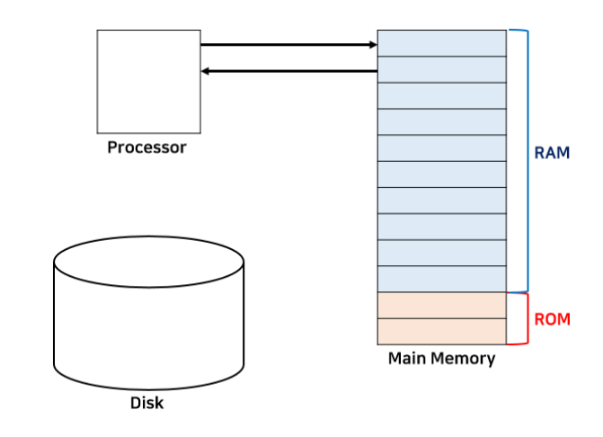 Main Memory 는 비휘발성인 ROM 과 휘발성 메모리인 RAM으로 구성되어 있다.