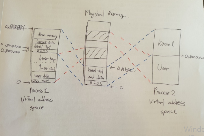user area는 virtual memory 0번지에서 시작하여 0x80000000 까지다. code, data, stack, heap이 순서대로 구성된다. 메모리를 가변적으로 사용하기 위해 heap은 0x80000000에서 아래방향으로 자란다. 그래야 stack과 heap의 크기를 가변적으로 늘였다 줄였다 할 수 있다. kernel area는 0x801000번지에서 높은 주소방향으로 자란다. BIOS 영역은 OS영역으로 Kernel이다. 위 그림에서는 user area가 연속되게 physical memory에 mapping되도록 표현되었다. 이는 그림상의 편이를 위한거고 실제로는 page 단위(4KB)로 메핑되어 있다.