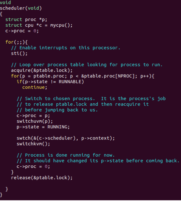 특이한 점은 scheduler()함수 return하지 않는다. 즉, 지속적으로 스케쥴링을 담당한다. 즉 다른말로 xv6 kernel이 scheduler() 함수로 진입한 후에는 지속해서 스케쥴링을 담당한다.