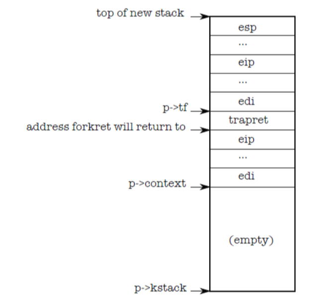 context의 eip레지스터(extension instruction pointer; 실행할 함수 주소)를 forkret() 함수 주소로 저장함으로써 생성된 프로세스가 스케쥴링되면 forkret() 함수가 실행된다. 또 eip 레지스터 다음에 trapret 함수의 주소를 저장함으로써 forkret() 함수가 return된 후 바로 trapret() 함수가 실행될 수 있도록 구성한다.