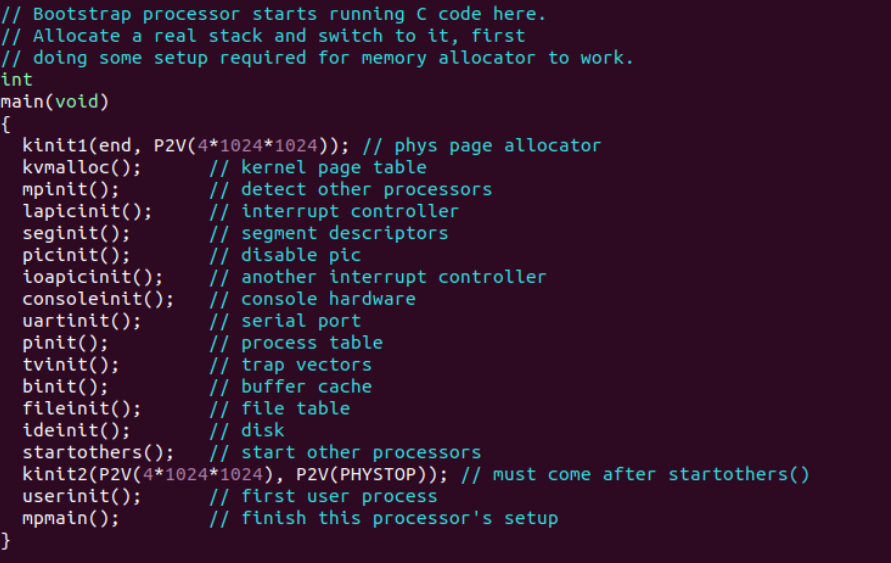 부팅이 완료되면, OS는 하나의 Process를 실행시켜주어야 한다. 이를 위하여 처음에 Main.c의 함수들을 하나씩 호출하게 된다.