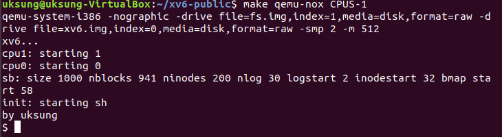 sudo apt-get install git wget qemusudo apt install build-essentialgit clone https://github.com/mit-pdos/xv6-public.gitsudo apt-get install gdb ( if you don't have it.. )cd xv6-publicmake qemu-nox CPUS=1#qemu exit Ctrl+A -> XRun