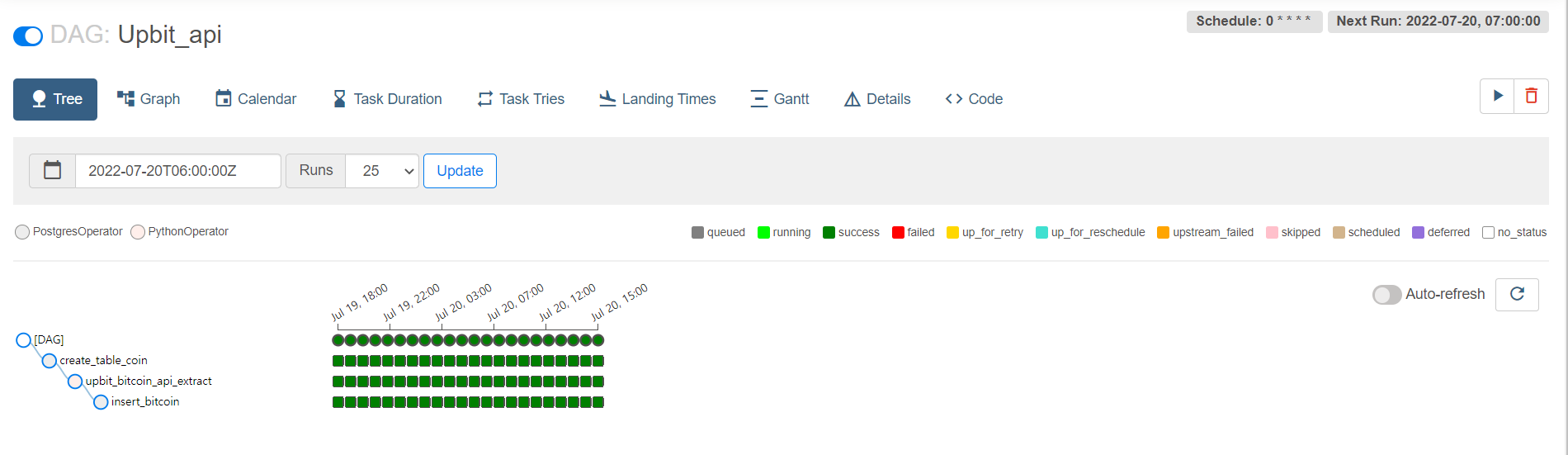 Airflow Operator는 Python Operator와 Postgres Operator를 두개를 사용하였습니다.
